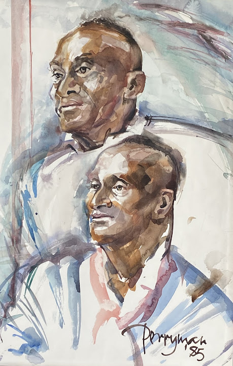 The twin brothers Greg and Gary Christmas were born in Boston in 1931/2 (just before and after New Year's Eve), a striking mixture of Afro and Native American origins. They toured the world in show business, dancing with The Supremes, Tina Turner, Diana Ross and many more, then finally settled in Amsterdam, where they served coffee and snacks in their highly colourful Backstage Boutique, dishing out bawdy humor, gems of personal wisdom, uncanny spiritual insights or surprising kindness to all comers. "Yeah, yeah, our mother's name really was Mary Christmas". "You want my coffee or my body?" For a while, my studio was situated near their café, so we became good friends. Inevitably, I dashed off a watercolour, as they gazed out of the window, commenting on the passers-by. "Oh, not her again! Hey, he's hot!" They liked my painting. "Not bad for a white man!"